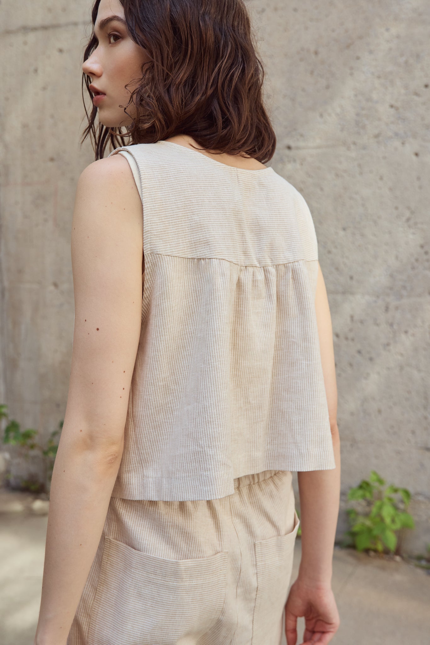 Optez pour ce débardeur à rayures doté d’une boutonnière frontale élégante. Sa coupe intemporelle structurée par des pinces poitrine à l’avant et des plis dans le dos sublime la silhouette tout en assurant un tombé impeccable. Un basique facile à assortir parfait pour toutes les occasions.