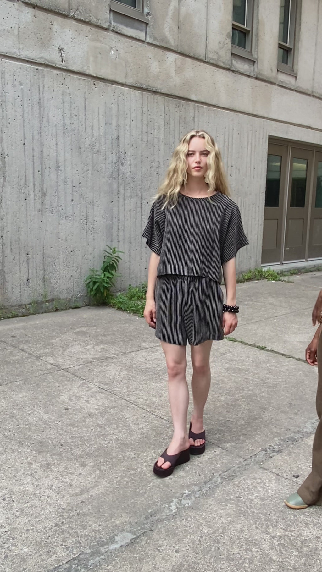 Georgia mesure 5’9 et porte la taille S (rayure ochre).