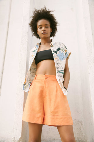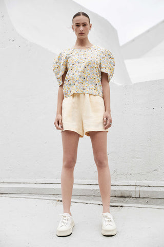 Le short en lin par excellence. Court, fluide, taille élastique. Un essentiel cet été. Couleur céréales. Fait à Montréal.